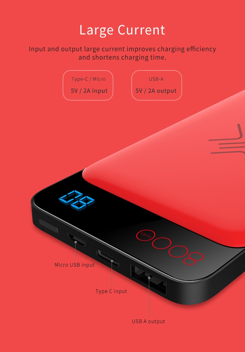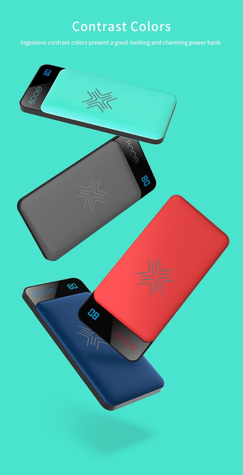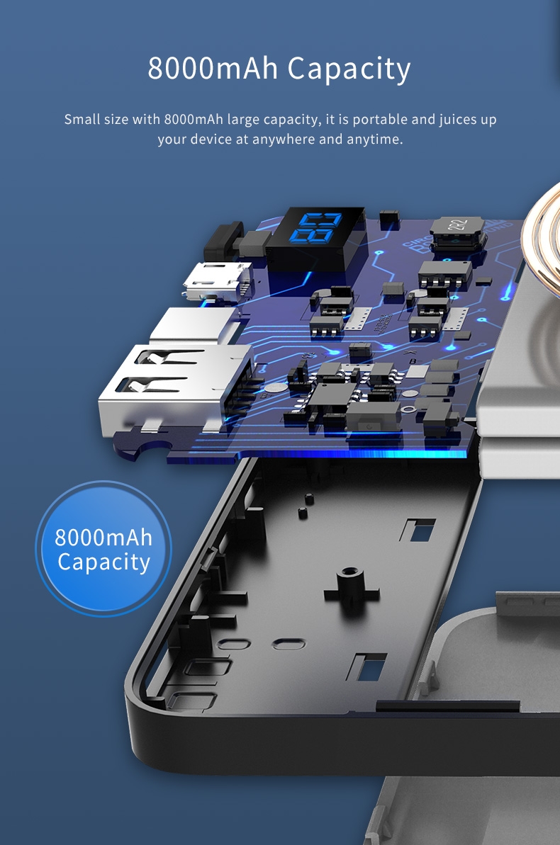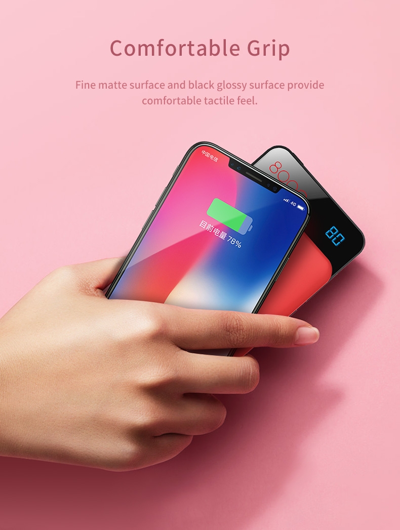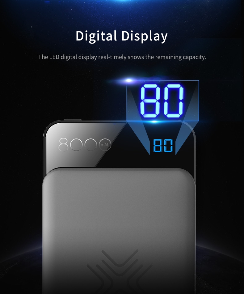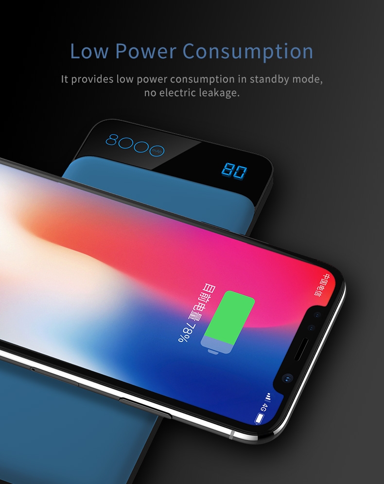 Small size with 8000mAh large capacity, it is portable and juices up your device at anywhere and anytime. It provides low power cosumotion in standby mode, no electric leakage.