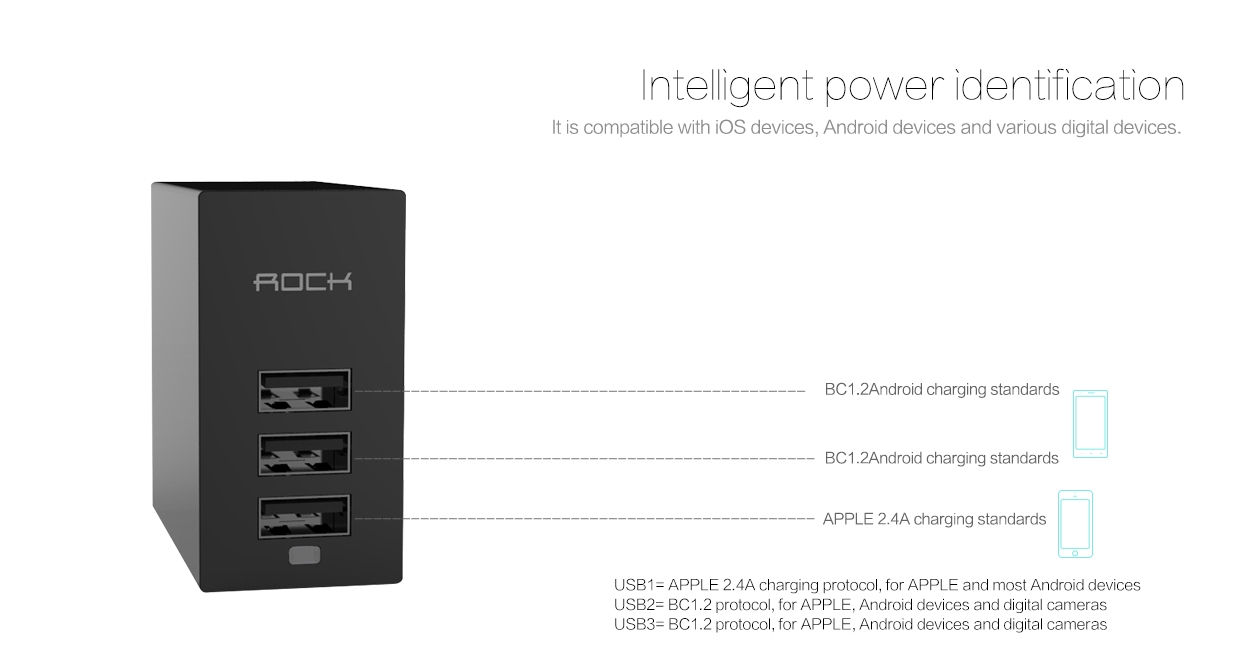The international advanced power management technology provides various protection, such as overcharging protection, over current protection, short-circuit protection, etc.. It is compatible with IOS devices, Android devices and various digital devices. The 3 ports can be worked at the same time. With multinational plug adapter design, it is convenient to work or travel abroad.