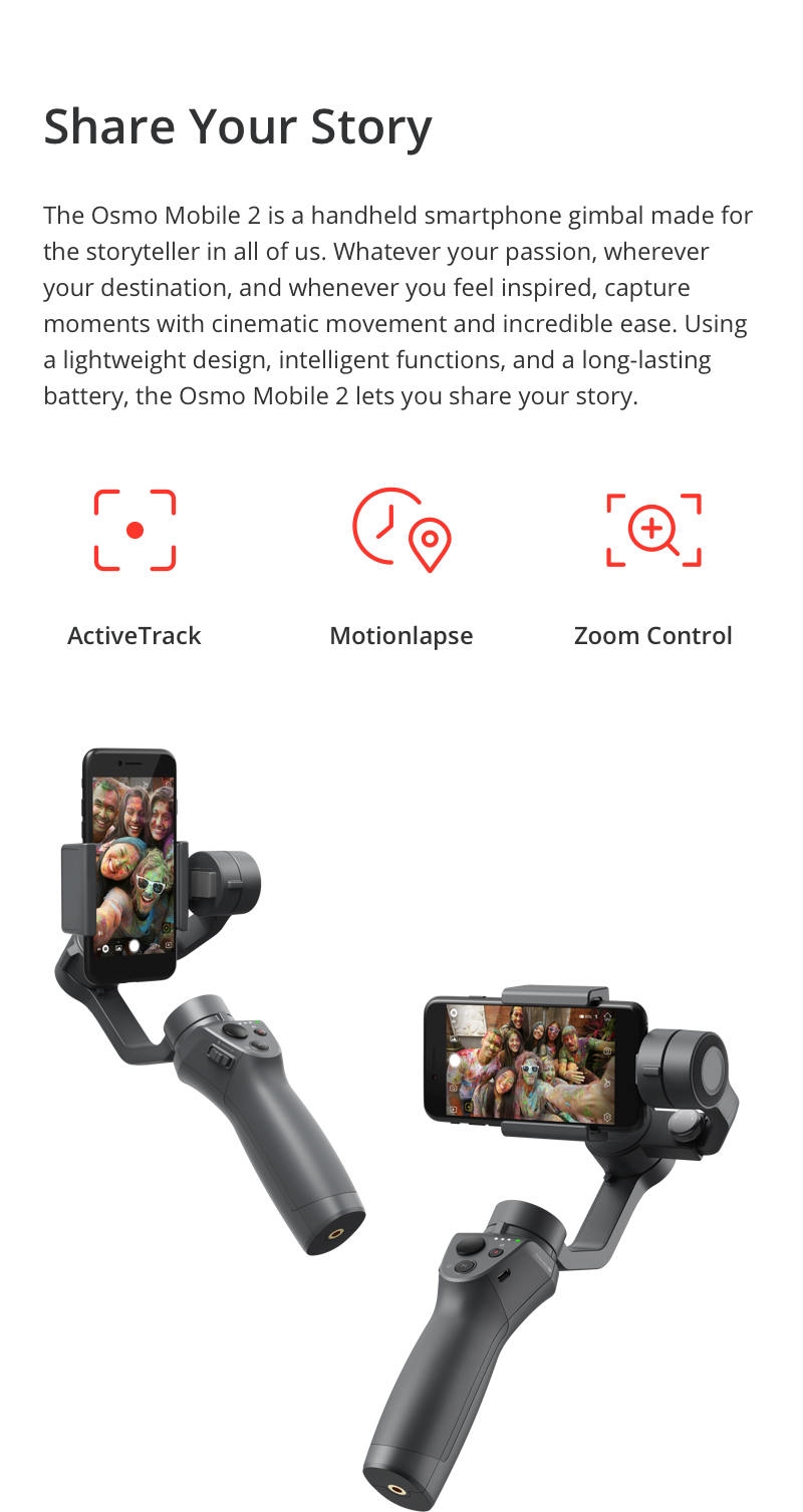 The Osmo Mobile 2 is a handheld smartphone gimbal made forth storyteller in all of us. Whatever your passion, wherever your destination, and whenever you feel inspired, capture moments with cinematic movement and incredible ease. Using lightweight design, intelligent functions, and a long-lasting battery, the Osmo Mobile 2 lets you share your story