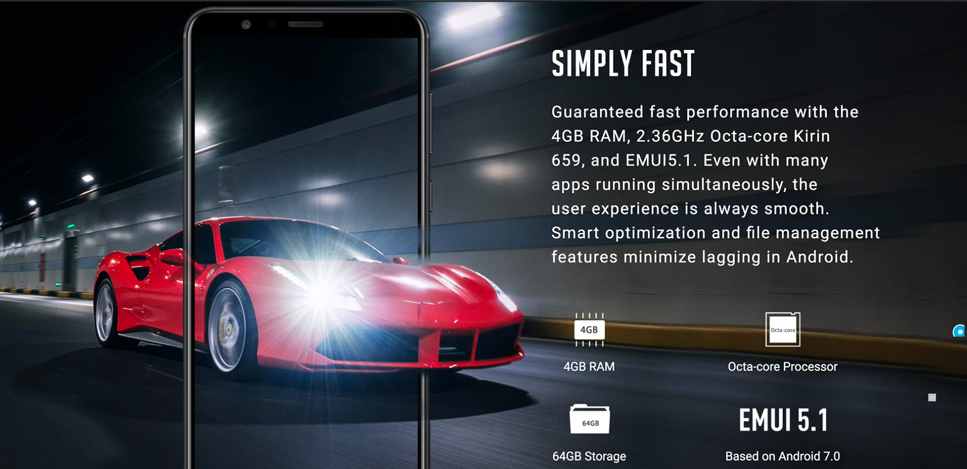 ANDROID 7.0 (Nougat) | OCTA-CORE (KIRIN 659) | 5.93'' FHD | 4GB RAM | 64GB ROM | REAR CAMERA 16MP + 2MP | FRONT CAMERA 8MP | BATTERY 3340mAh