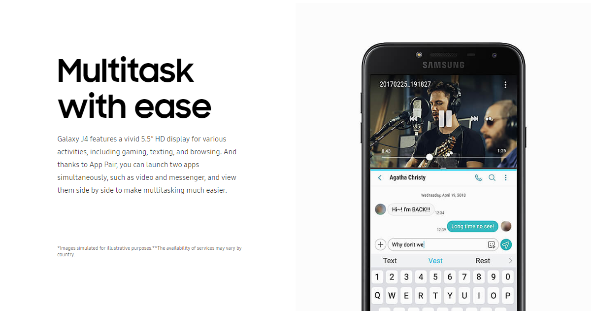 Take your mobile viewing experience to new heights. Galaxy J4 features a large 5.5” HD display that grants users excellent contrast ratio with virtual true-to-life images. Now, you can enjoy your favourite multimedia content in vivid and natural colour.