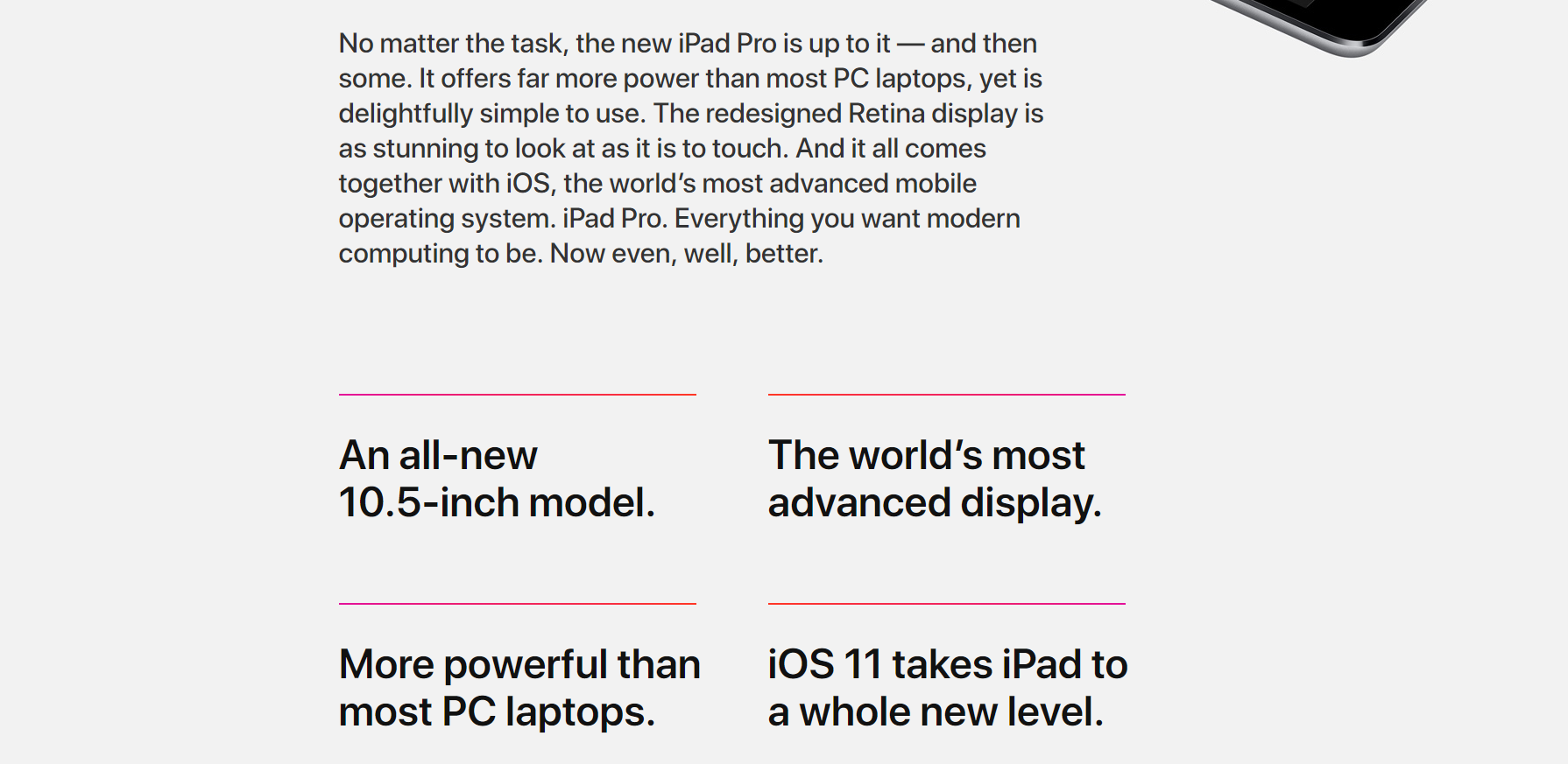 No matter the task, the new iPad Pro is up to it — and then some. It offers far more power than most PC laptops, yet is delightfully simple to use. The redesigned Retina display is as stunning to look at as it is to touch. And it all comes together with iOS, the world’s most advanced mobile operating system. iPad Pro. Everything you want modern computing to be. Now even, well, better.